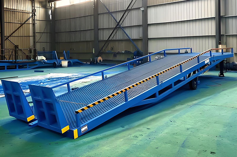 移動式登車橋(移動式裝卸貨平臺、集裝箱裝卸平臺)是與叉車配合使用的貨物裝卸輔助設備,可根據汽車車廂的高低調節高度,叉車可以直接通過本設備駛入車廂內部進行貨物的批量裝卸,僅需單人作業,即可實現貨物的快速裝卸。它使企業減少大量勞力,提高工作效率,獲取更大經濟效益。臺面采用特制的菱形網格板有可靠的強度,能保證長期使用而不變形。它的菱形網狀結構,充分保證了卓越的防滑性能,使叉車有更好的爬坡性和可操縱性。即